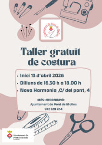 Actualitat, General, Notícies Taller gratuït de costura 24/03/2026 - 31/07/2027 Inici dia 13 d’abril de 2026 Els dilluns de 16.30h a 18.00h al local Nova Harmonia, c. del Pont, núm. 4 < Entrada AnteriorEntrada Posterior >